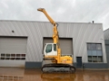 It features a high air-conditioned cabin for excellent visibility and operator comfort, and runs on rubber tracks for stability and mobility.